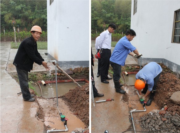 為盡快幫助村民解決用水問題,安裝小組冒雨前往。在安裝現(xiàn)場,我們看到有人在使用套絲機,有人在接水管,大伙忙的不亦樂乎。經過2個小時的奮戰(zhàn),順利為其接通水源,安好水表,并裝好了水龍頭。當現(xiàn)場看到水龍頭流出水的那瞬間,大家的心情都非常激動,費某的臉上更露出了久違的笑容,欣喜的用手接起了新家的“第一股清泉”。