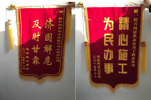 12月29日下午,公司相繼收到湖塘街道永信村和錢清九巖村村委送來(lái)的“濟(jì)困解危,及時(shí)甘霖”和“精心施工,為民辦事”兩面錦旗,對(duì)工程分公司工作人員辛勤勞動(dòng)、甘于奉獻(xiàn)的工作精神表示贊賞和感謝。